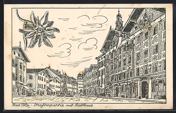 Künstler-AK Bad Tölz, Strassenpartie mit Rathaus