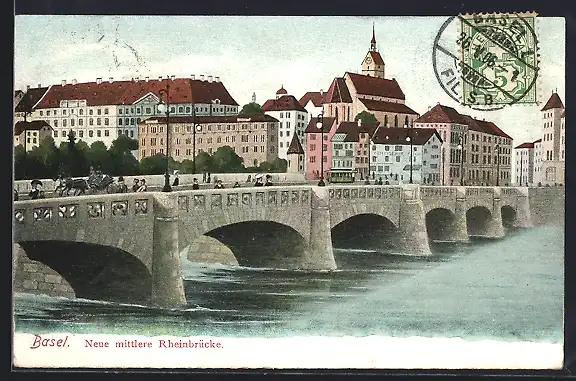 Künstler-AK Basel, Neue mittlere Rheinbrücke mit Confiserie und Strassenbahn
