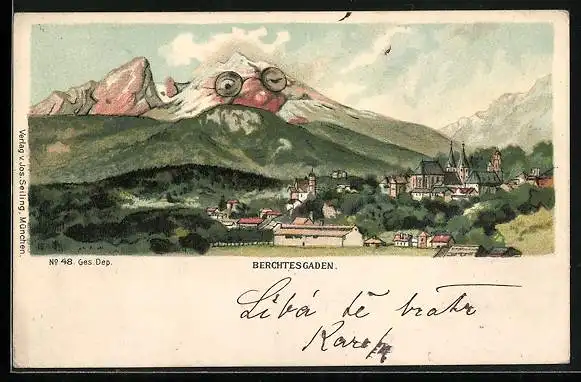 Künstler-AK Berchtesgaden, Ortsansicht, Berg mit Gesicht, Berggesichter, Seiling Nr. 48