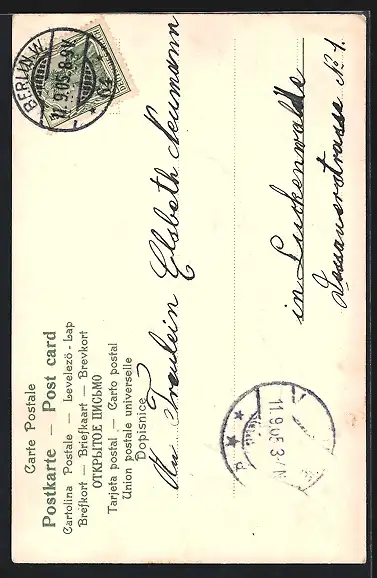 alte Ansichtskarte, gelaufen 1905, Eckknick oben li., Stempelspur, guter Zustand