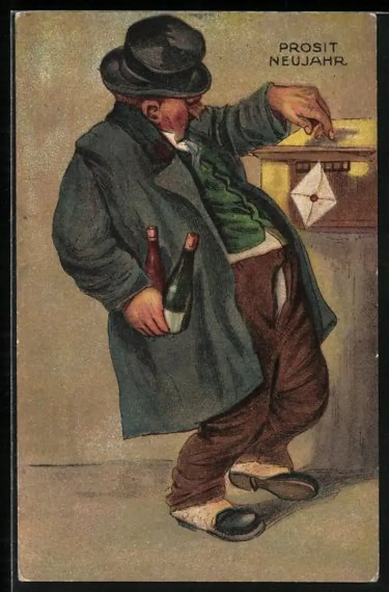 Künstler-AK Betrunkener Mann mit einem Brief an einem Briefkasten, Prosit Neujahr