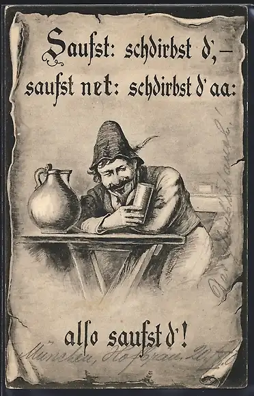 Künstler-AK Betrunkener im Wirtshaus, Saufst, schdirbst`, saufst net, schdirbst d`aa