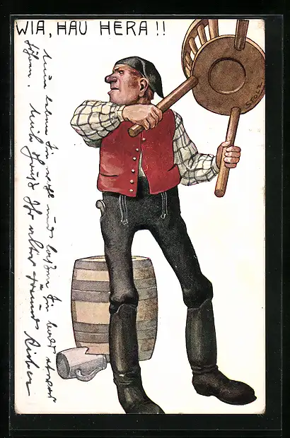Künstler-AK Braumeister mit Hocker bereit sich zu wehren