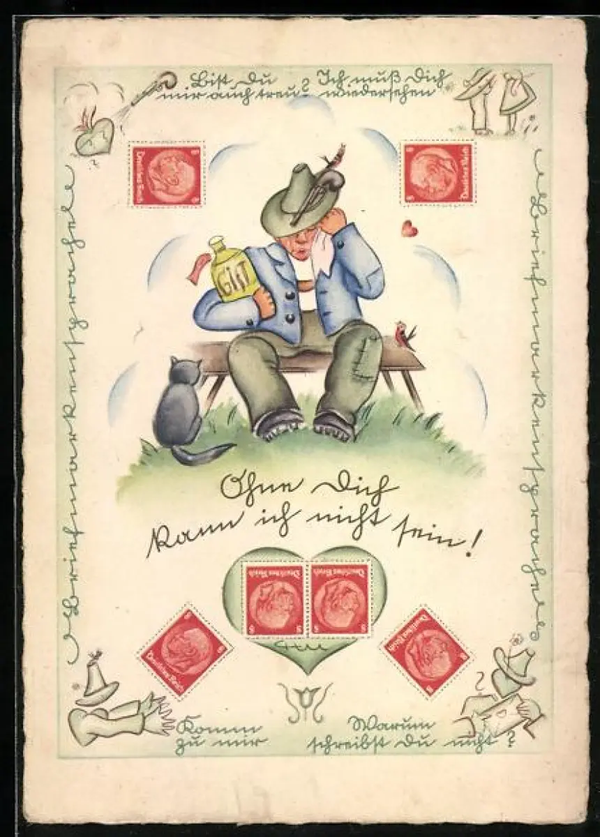 Künstler-AK Briefmarkensprache, Mann mit Katze und Gift auf einer Bank
