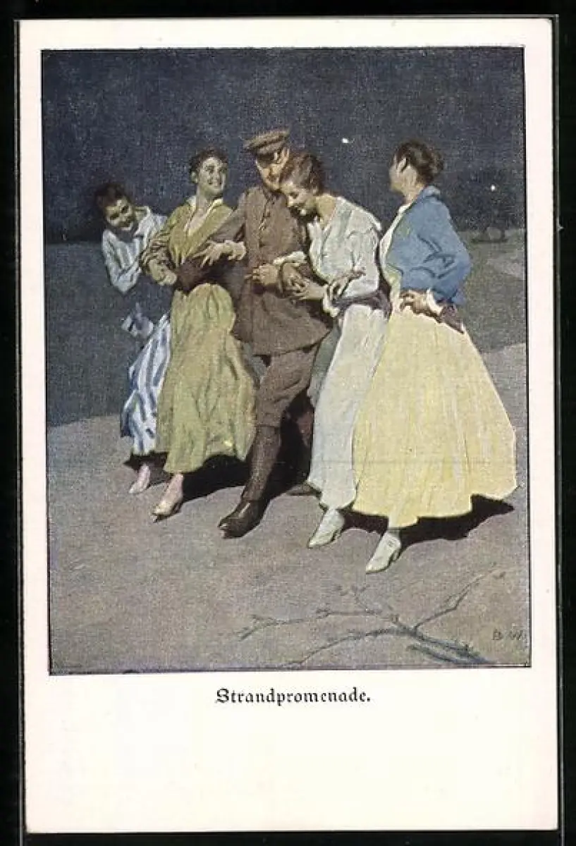 Künstler-AK Brynolf Wennerberg: Strandpromenade, Soldaten mit vier jungen Damen