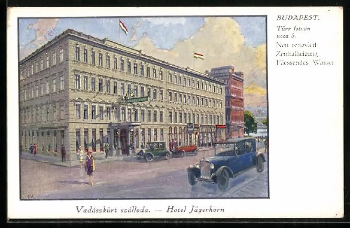 Künstler-AK Budapest, Hotel Jägerhorn, parkende Autos, wehende ungarische Fahnen