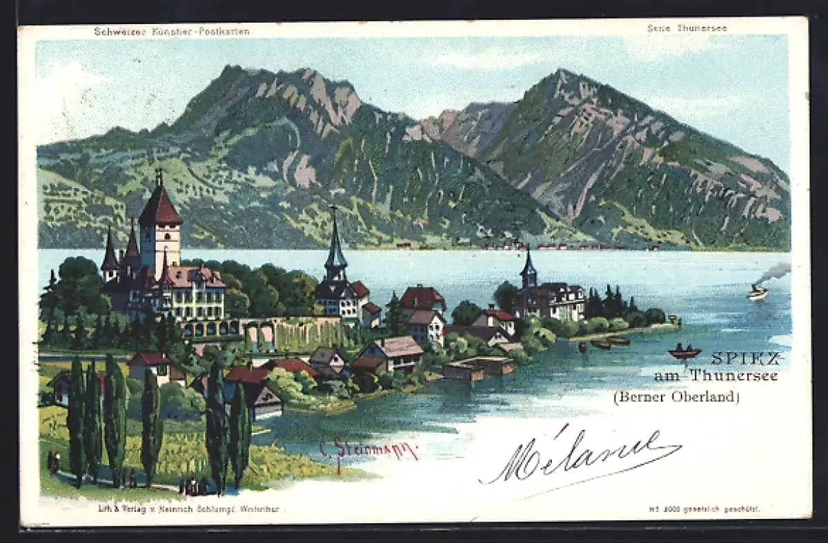 Künstler-AK C. Steinmann: Spiez am Thunersee / Berner Oberland, Ortsansicht