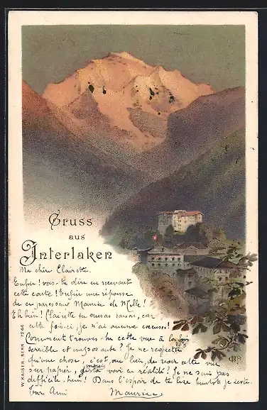 Künstler-AK Carl Biese: Interlaken, Teilansicht der Stadt bei Alpenglühen