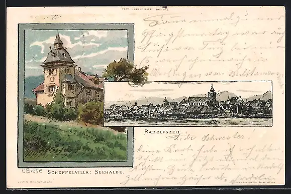 Künstler-AK Carl Biese: Radolfzell, Totalansicht, Schefflervilla Seehalde