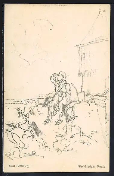 Künstler-AK Carl Spitzweg: Mann sitzt auf einem Stein und blickt in die Ferne