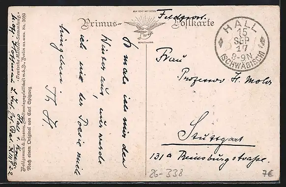 alte Ansichtskarte, gelaufen 1917 als Feldpost, rückseitig Oberflächenschaden, guter Zustand