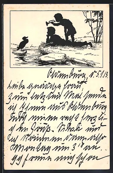 Künstler-AK Carus: Zwei Kinder beobachten eine Ente, Ein Kind spielt Trompete