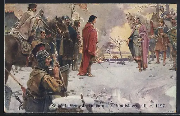 Künstler-AK Ceska Historie v Obrazich, Setkani Premysla Otakara I. s Vladislavem III. r. 1197