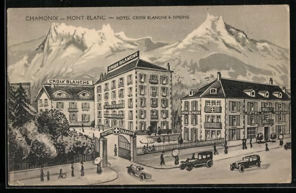 Künstler-AK Chamonix /Mont-Blanc, Hôtel Croix Blanche & Simond avec vue sur les montagnes enneigées