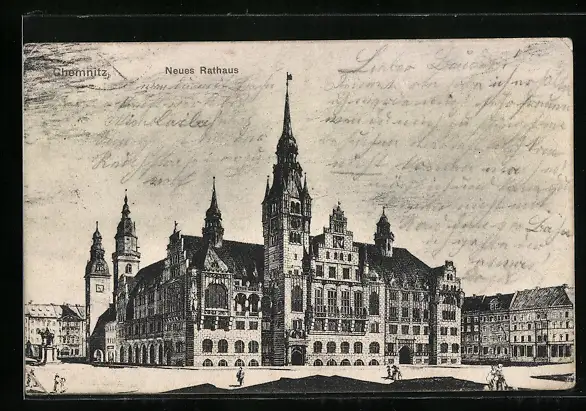 Künstler-AK Chemnitz, Neues Rathaus mit Denkmal