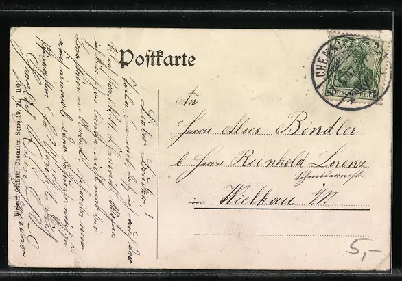 alte Ansichtskarte, gelaufen 1907, Eckknicke links u. rechts, Bugspur re. unten, guter Zustand