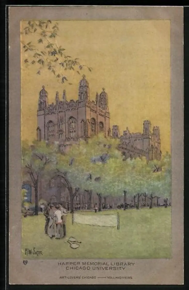 Künstler-AK Chicago, IL, University, Harper Memorial Library, Tennisplatz