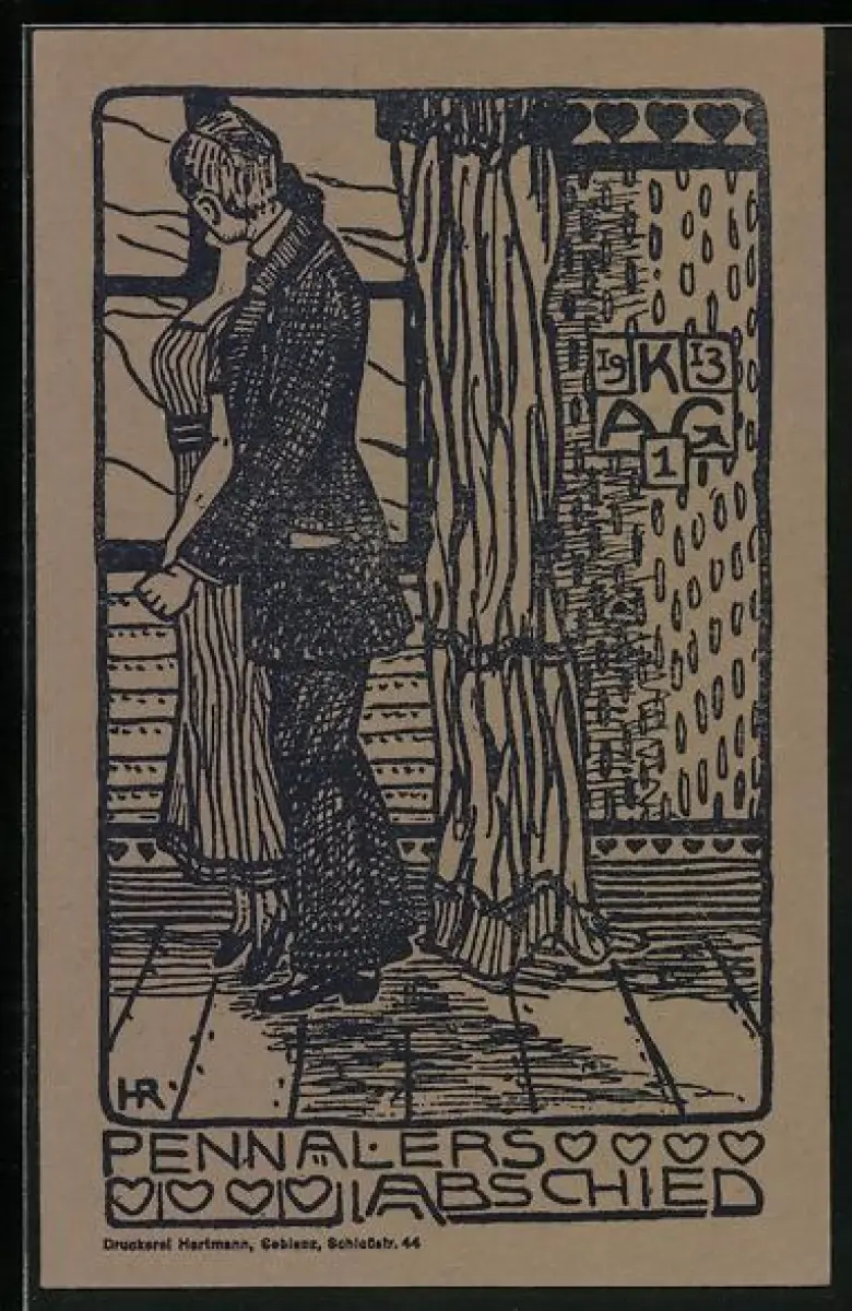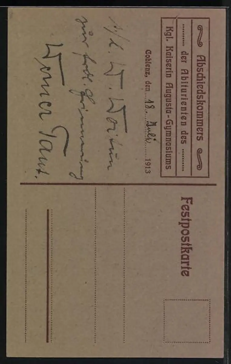 Künstler-AK Coblenz, Abschiedkommers der Abiturienten des Kgl. Kaiserin Augusta-Gymnasiums 1913, Pennälers Abschied