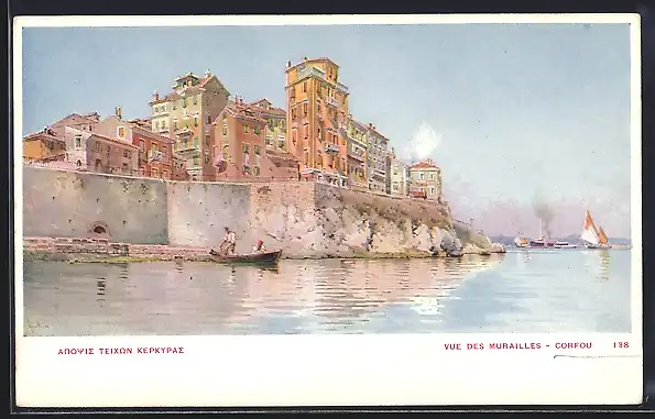 Künstler-AK Corfou, Vue des Murailles, Häuser am Wasser