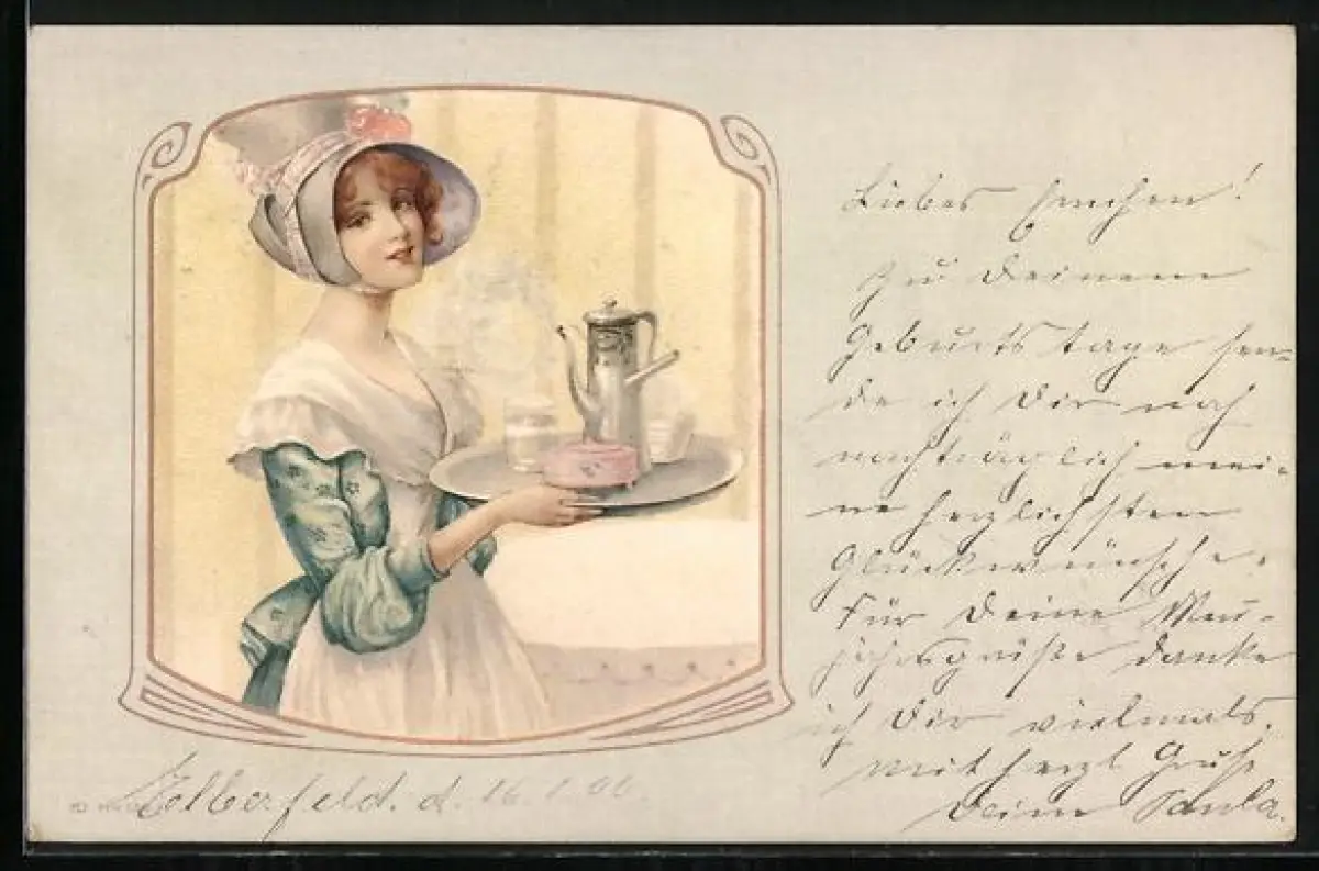 Künstler-AK Dame trägt ein Tablett mit Tee, Jugendstil