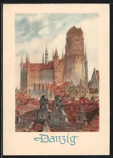 Künstler-AK Danzig / Gdansk, Totalansicht mit Kirche