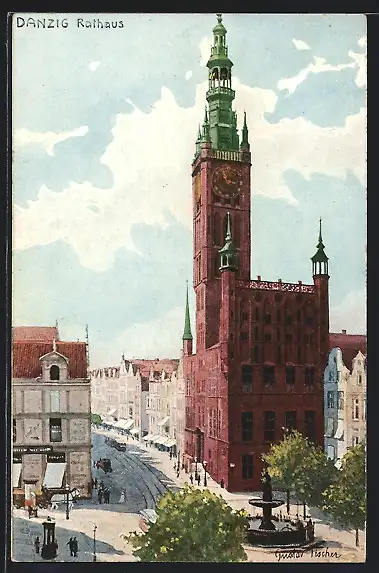 Künstler-AK Danzig, Rathaus mit Brunnen
