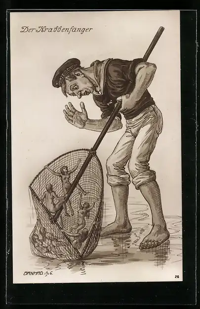 Künstler-AK Der Krabbenfänger, Erstaunter Fischer mit Netz voller kleiner nackter Frauen