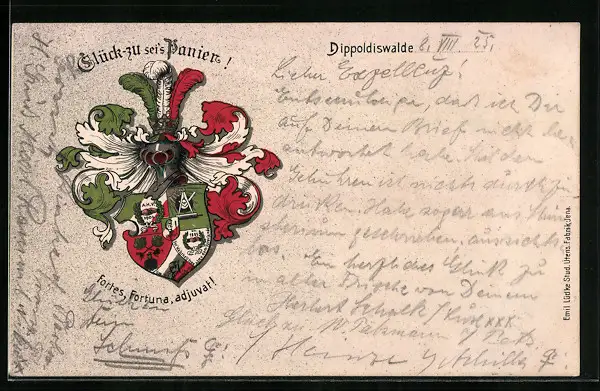Künstler-AK Dippoldiswalde, Glück zu sei`s Panier, Ritterhelm und Studentenwappen, Absolvia