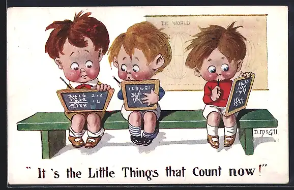Künstler-AK Donald McGill: Kinder mit Schiefertafeln, It`s the Little Things that count now!