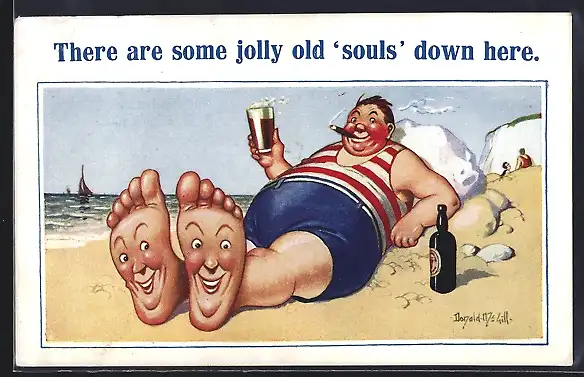 Künstler-AK Donald McGill: Mann sitzt mit Bier am Strand, There are some jolly old souls down here