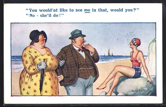 Künstler-AK Donald McGill: Paar am Strand sieht junge Frau in Badeanzug