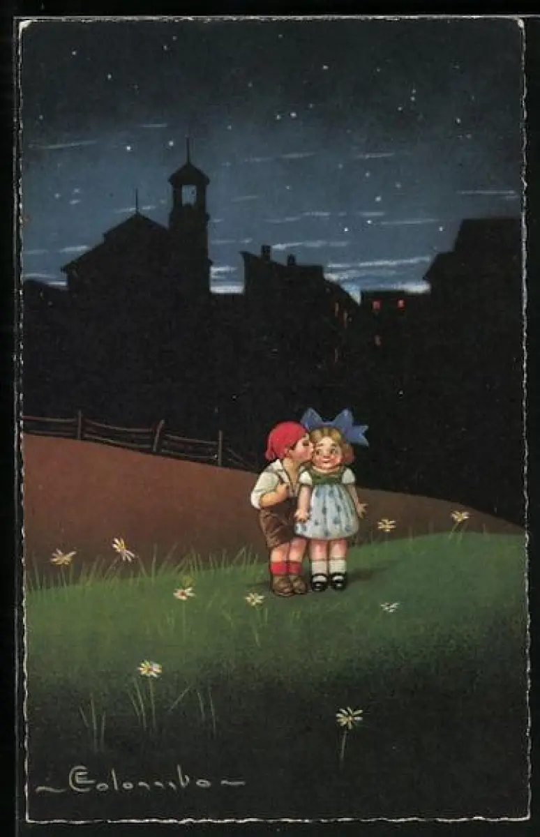 Künstler-AK E. Colombo: Kleiner Junge küsst seine Geliebte bei Nacht