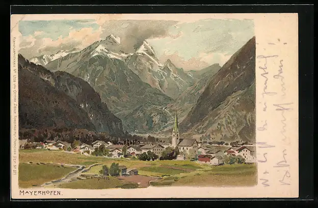 Künstler-AK Edward Theodore Compton: Mayrhofen, Ortsansicht gegen die Berge