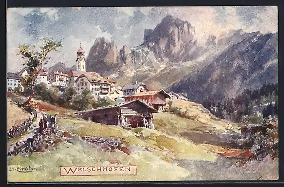 Künstler-AK Edward Theodore Compton: Welschnofen, Ortsansicht mit Gebirgspanorama