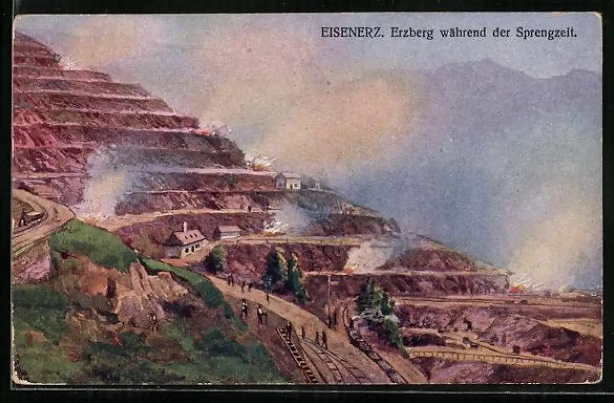 Künstler-AK Eisenerz, Erzberg während der Sprengzeit, Häuser, Leute
