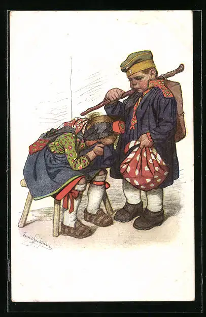 Künstler-AK Emil Beithan: Junge in Uniform tröstet Freundin in Tracht zum Abschied