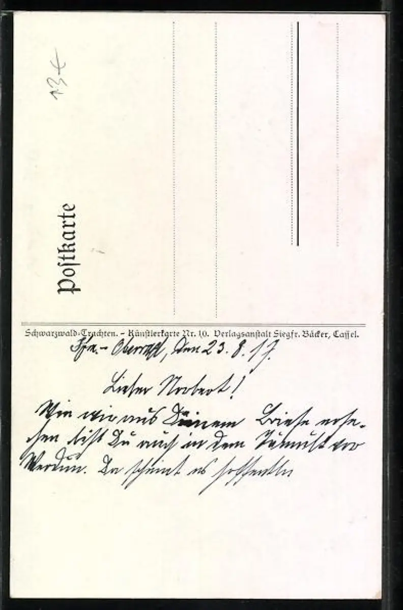 Personenbezogene Daten auf der Rückseite der Karte wurden durch blauen Textmarker unkenntlich gemacht. Die blauen Stellen sind auf die Vorderseite durchgeweicht und wirken sich negativ auf das Postkartenfoto aus
