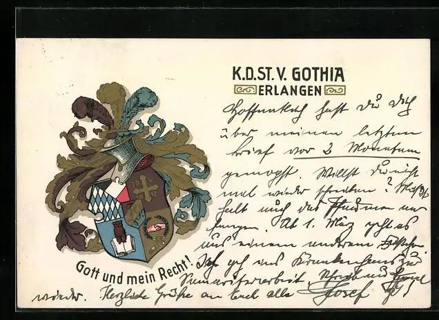 Künstler-AK Erlangen, K. D. St. V. Gotha, Ritterhelm und Studentenwappen