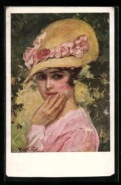 Künstler-AK Ernst Heilemann: Schüchtern guckende Dame mit Hut