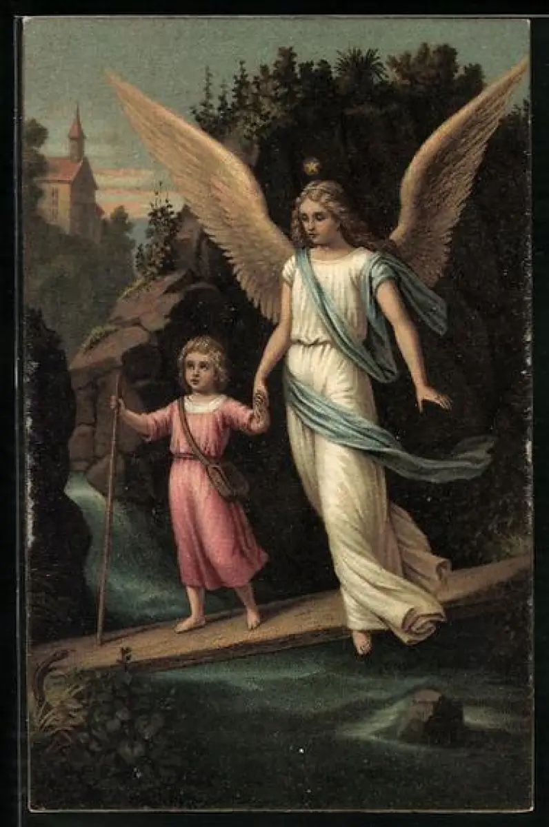 Künstler-AK F. Leiber: Der heilige Schutzengel mit Mädchen auf dem Steg