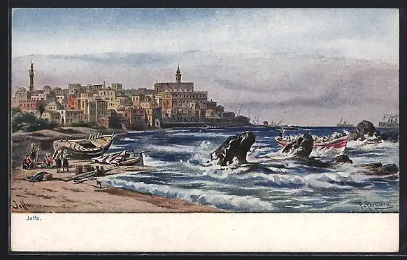 Künstler-AK F.Perlberg: Jaffa, Strandpartie mit Booten