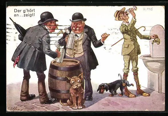 Künstler-AK F.Schlemo: Der g`hört an...zeigt!, dicke Biertrinker lästern über Wassertrinker, Dackel