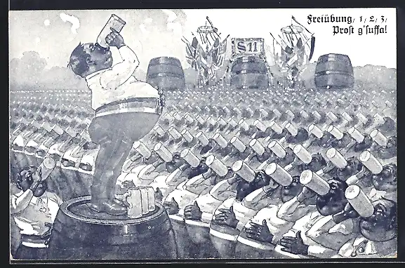 Künstler-AK F.Schlemo: Freiübung, Trinker leeren Bierkrug
