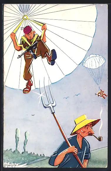 Künstler-AK Fallschirmspringer mit MPI erblickt ungläubig einen Bauer mit scharfer nach oben gehaltener Heugabel