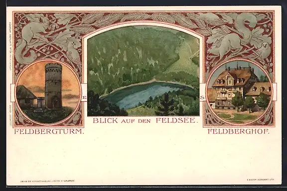 Künstler-AK Feldberg / Schwarzwald, Feldbergturm, Feldberghof und Feldsee