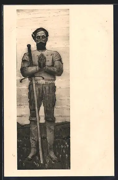 Künstler-AK Ferdinand Hodler: Betender Krieger auf Wiese, Schwert