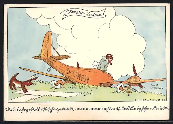 Künstler-AK Flieger-Humor, Flieger-Latein, Das Fahrgestell ist sehr geknickt...