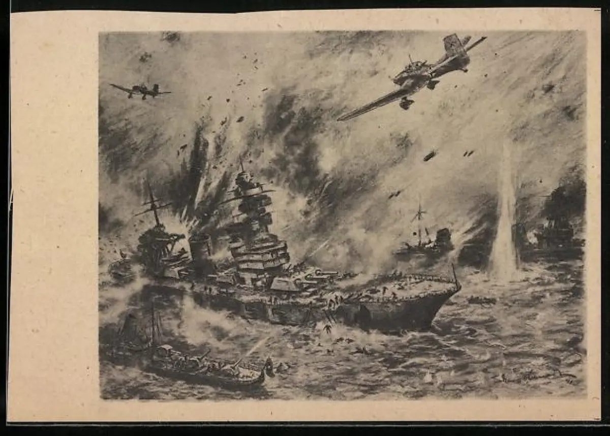 Künstler-AK Flieger bombardieren Kampfschiffe