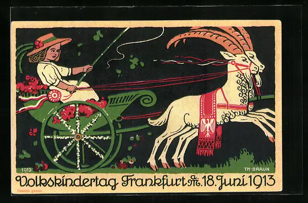 Künstler-AK Frankfurt a. M., Festpostkarte zum Volkskindertag 1913, Kind in Ziegenwagen