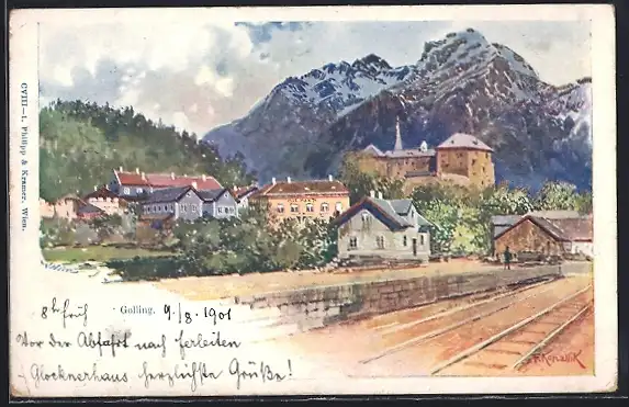 Künstler-AK Franz Kopallik: Golling, Panorama mit Bahnhof